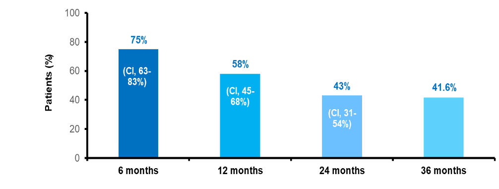 - 28% improvement in FFS at 1 year(ref 4): 61.2% of patients treated with Rezurock (LOT-episodes = 113) remained failure-free 47.8% of those on BAT (LOT-episodes = 245) remained failure-free