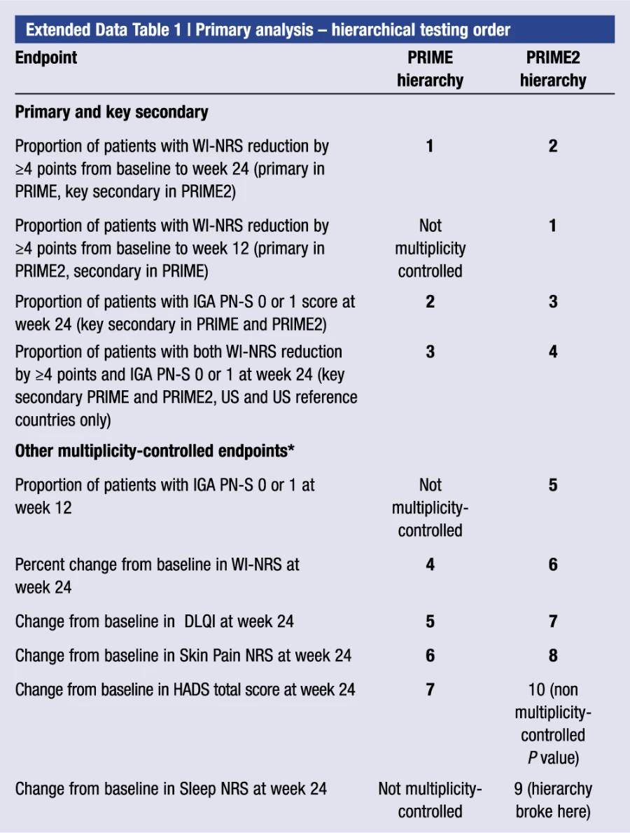 The primary endpoint in both trials addressed clinically meaningful itch improvement. A weekly WI-NRS score was calculated as the average of daily non-missing scores within the week window of each trial week. The trials were originally designed similarly, with week 12 as the timing for the primary endpoint. However, results from PRIME2, which preceded PRIME, showed continued improvement of itch after week 12. To represent more precisely the effect of the treatment on itch and to harmonize the assessment of the itch and lesion endpoint evaluations, a protocol amendment was submitted and approved while the PRIME study was ongoing to change the timing for the primary endpoint to week 24.
