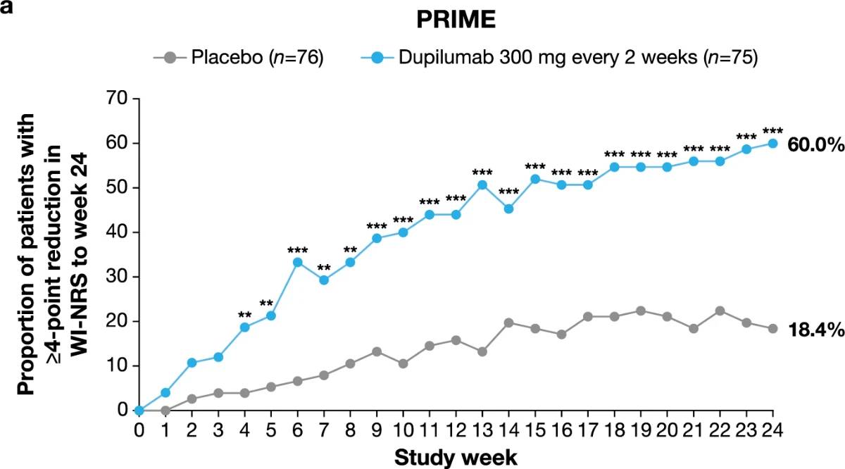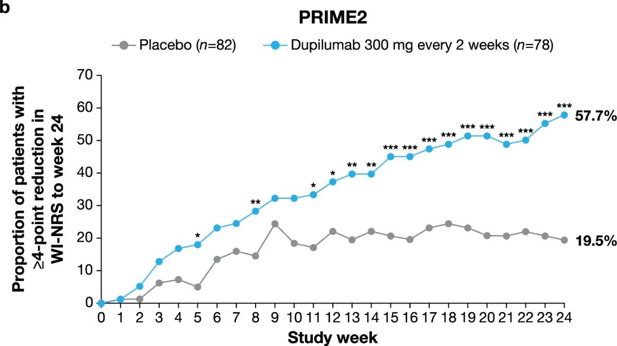 Proportion of patients achieving a ≥4-point reduction in WI-NRS was also higher in the dupilumab group compared to placebo at week 12 in PRIME: 44% versus 15.8% (95% CI for the difference, 14.5–43.8; non-multiplicity-controlled P < 0.001) and at week 24 in PRIME2 (key secondary endpoint): 57.7% versus 19.5% (95% CI for the difference, 29.1– 56.1; P < 0.001) (Table 2, Fig. 2a and Supplementary Table 5). Compared to placebo, non-multiplicity-controlled significant improvements in least squares (LS) mean percent change in weekly average WI-NRS with dupilumab were observed as early as week 3 in PRIME and week 4 in PRIME2 (Fig. 3a). The proportion of patients achieving a ≥4-point reduction in WI-NRS was significantly higher with dupilumab than with placebo starting at week 4 in PRIME and week 5 in PRIME2 (non-multiplicitycontrolled P versus placebo <0.05) (Extended Data Fig. 2).