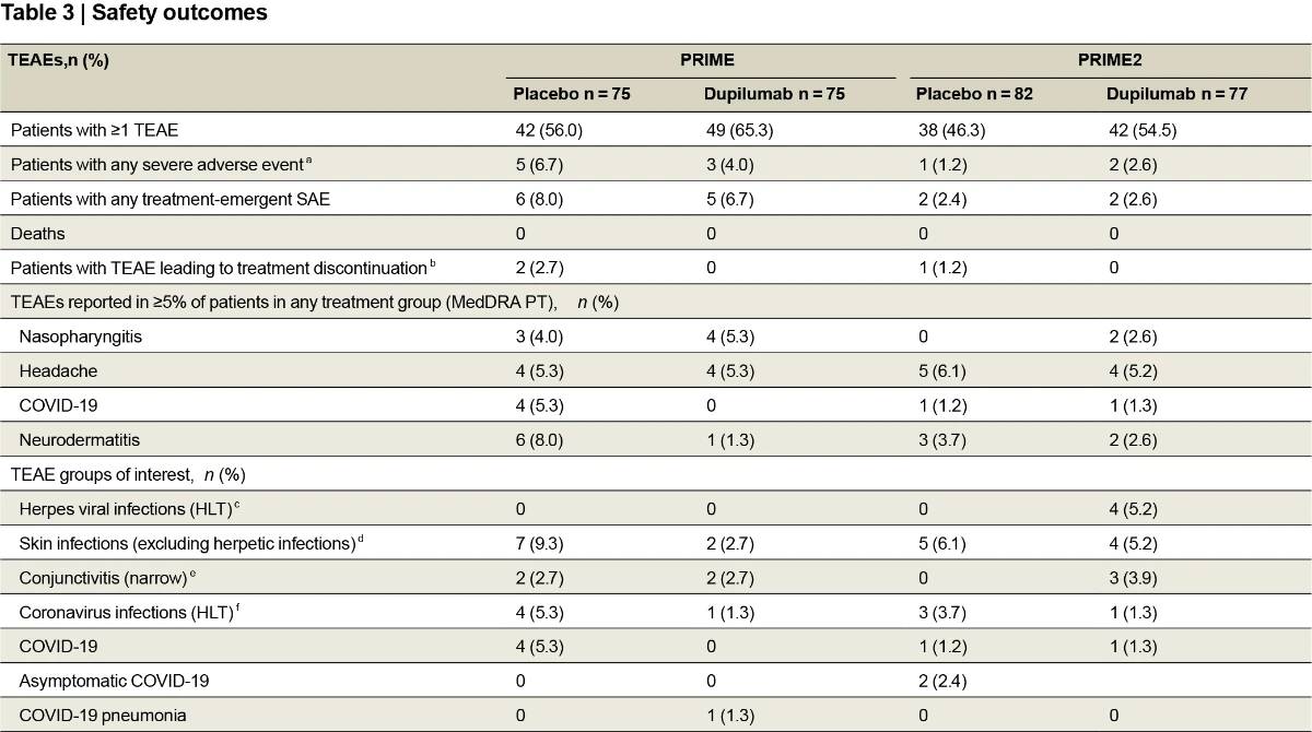 Included in the analysis were all patients in the safety analysis set, which included all randomized patients who received ≥1 dose of dupilumab or placebo. Patients are listed according to the study drug they received, which may differ from the randomized group. Results are reported for the 24 weeks of treatment. aConsidered unrelated to the study intervention except for two events of sepsis and mesenteritis, experienced by one placebo-treated patient in PRIME. bIn PRIME, one event each of Hodgkin’s disease and neurodermatitis (MedDRA PTs), considered unrelated to the study drug. In PRIME2, one event of urticaria. cHerpes viral infections (HLT) includes MedDRA PTs oral herpes, herpes zoster, ophthalmic herpes zoster and genital herpes simplex. None of these TEAEs was severe, and all patients recovered with corrective treatment while continuing dupilumab. dSkin infection TEAEs (excluding herpetic infections) were identified based on blinded medical review of all reported TEAEs identified as possible skin infections using CMQ30067. This search included MedDRA PTs under HLGT Skin and subcutaneous tissue infections and infestations, all MedDRA PTs under HLT Skin structures and soft tissue infections, all MedDRA PTs of ‘wound infection’ and MedDRA PTs of chalazion, hordeolum and skin papilloma. eConjunctivitis (narrow term) includes MedDRA PTs conjunctivitis, conjunctivitis bacterial, conjunctivitis viral, conjunctivitis adenoviral, conjunctivitis allergic and atopic keratoconjunctivitis. fCoronavirus infections (HLT) include MedDRA PTs COVID-19, asymptomatic COVID-19 and COVID-19 pneumonia. COVID-19, Coronavirus Disease 2019; HLGT, MedDRA High-Level Group Term; HLT, MedDRA High-Level Term; MedDRA, Medical Dictionary for Regulatory Activities; PT, MedDRA Preferred Term.