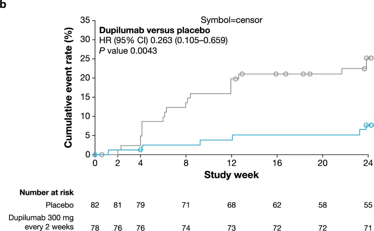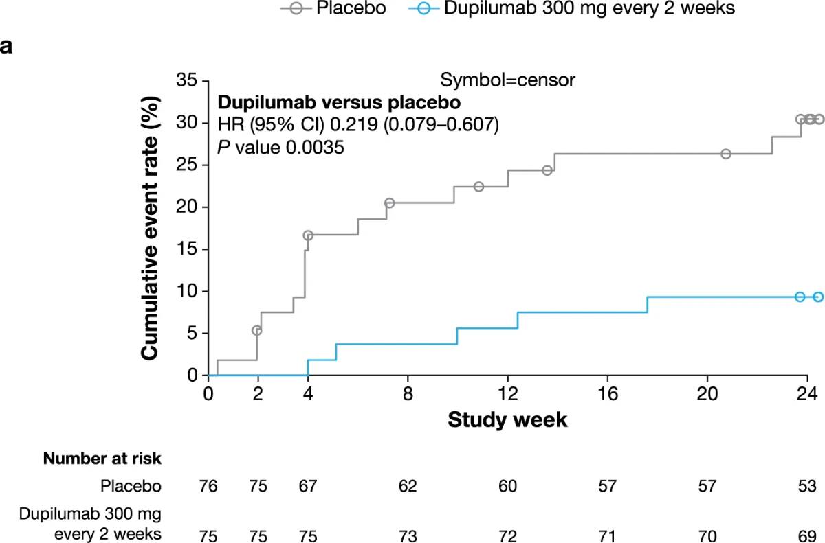 Fewer dupilumab-treated patients required rescue medication compared to those given placebo during the 24-week studies (PRIME, 6.7% versus 21.1%; PRIME2, 7.7% versus 24.4%; non-multiplicity-controlled P versus placebo = 0.004 in both trials) (Table 2 and Extended Data Fig. 5). Results for additional efficacy endpoints are summarized in Extended Data Table 5. This manuscript reports on all the multiplicity-controlled and pre-specified supportive endpoints included in the PRIME and PRIME2 trials. Additional pre-specified secondary and tertiary efficacy