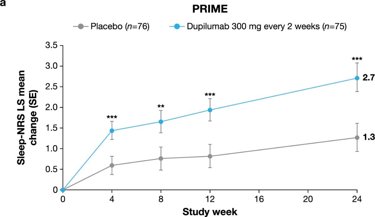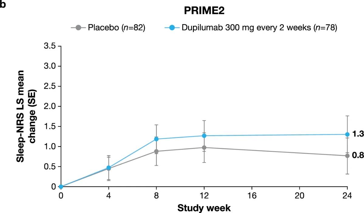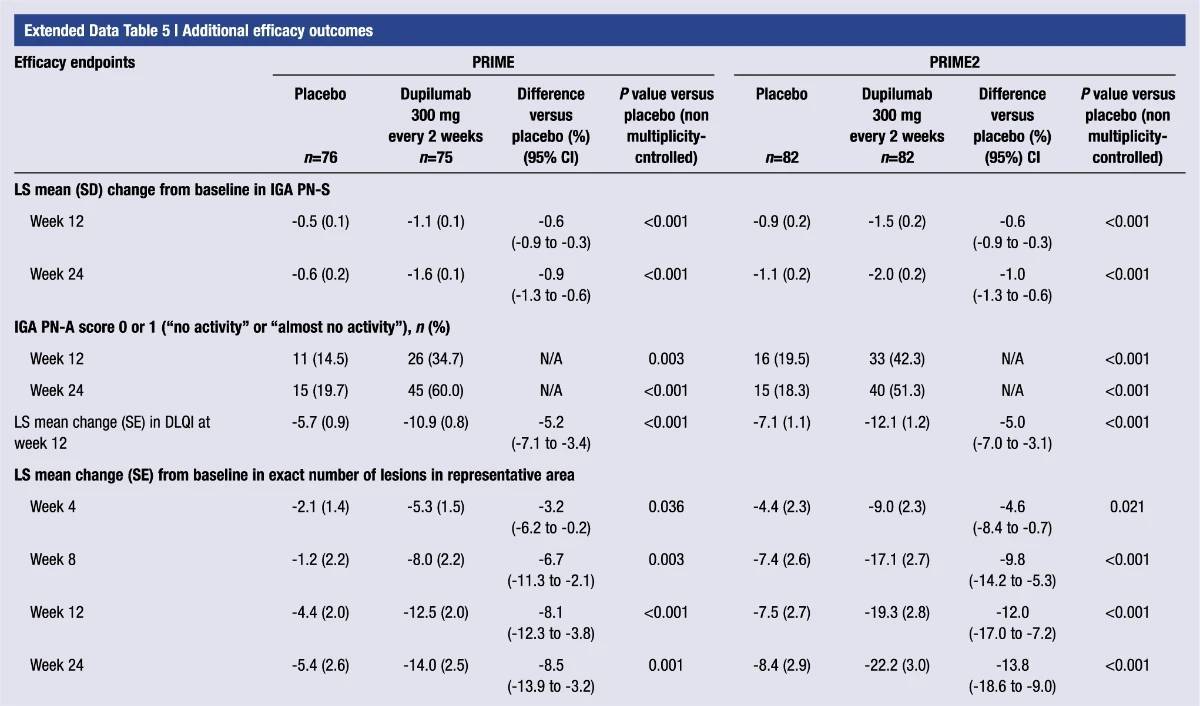 Management of PN is challenging2,18,19, particularly for patients with moderate or severe PN for whom topical therapies are, in many cases, insufficient to control the disease20–22. Other treatments currently used for PN also have limitations, including unsatisfactory effective-ness and associated side effects and toxicities23. In PRIME and PRIME2, dupilumab compared to placebo significantly improved multiple meas-ures of signs and symptoms as well as health-related QoL in patients with PN. These data represent the first replicate positive results from two phase 3, randomized, placebo-controlled global trials.Given the seminal role of pruritus and resultant scratching in the patient experience with PN, as exemplified by the ‘butterfly sign’ where there is an absence of lesions in regions of the body that the patient cannot easily reach, this was chosen as the primary endpoint for the trial40. The 24-week treatment period was considered an appropriate duration to observe dupilumab’s effect in PN to ensure an adequate evaluation of PN lesions based on the observation that dupilumab has shown clinical efficacy and biomarker data, including thymus and activation-regulated chemokine (TARC) and eotaxin-3, plateauing before week 24 in all phase 3 clinical trials across all dupilumab indications41.Despite previous use of topical and, in over 60% of patients, sys-temic therapies, the patients enrolled in PRIME and PRIME2 had a high disease burden at baseline, with severe itch and skin lesions impacting sleep, QoL and mental health. All primary and key secondary endpoints addressing itch and number of skin lesions were met in both trials. Non-multiplicity-controlled significant itch improvement started as early as week 3 or 4, with progressively larger treatment differences from placebo throughout the 24-week treatment period. From an initial baseline of 20 to >100 nodules, 32.0% (PRIME) and 25.6% (PRIME2) of dupilumab-treated patients showed a reduction to ≤5 nodules, cor-responding to a response of ‘clear’ or ‘almost clear’ skin at week 12, compared to 11.8% and 12.2% of placebo-treated patients; the treat-ment effect on skin lesions continued to improve after week 12, with 48.0% (PRIME) and 44.9% (PRIME2) of patients achieving ≤5 nodules at week 24 with dupilumab versus 18.4% and 15.9%, respectively, with placebo. Approximately one-third of dupilumab-treated patients met the composite pruritus and skin lesion endpoint at the end of treat-ment. Dupilumab treatment also led to fewer patients using rescue medication compared to placebo in both trials.Improvements in skin pain mirrored those in itch throughout both trials, with non-multiplicity-controlled significant improvement starting at week 3 and week 4 in PRIME and PRIME2, respectively. Dupilumab-treated patients experienced non-multiplicity-controlled significant improvement in DLQI from week 4 and, by the end of the treatment, achieved mean DLQI scores at the threshold between ‘small’ and ‘moderate’ impact on life in both trials, whereas the ‘very large’ impact of PN on QoL at baseline was maintained in placebo groups to week 24. Improvements (non-multiplicity-controlled sig-nificance in PRIME2) were also seen for HADS anxiety and depression.The safety profile of dupilumab observed in PN was consistent with its known safety profile42–45. TEAEs most frequently reported with dupilumab versus placebo were conjunctivitis and herpes viral infec-tion, none of which was serious/severe or led to treatment discontinu-ation. In contrast, non-herpetic skin infections occurred more often in placebo-treated patients.More than 50% of patients enrolled did not have an atopic background, and only 4% had concomitant mild AD. Efficacy was consistent regardless of the assessed atopic or non-atopic status, although patients with moderate-to-severe atopic dermatitis were not included in this study. These results support PN as a disease independent from AD. Thus, whether one has concomitant AD or not, the pathophysiology of PN may be highly conserved in terms of nodules yet distinct from AD lesions.Concomitant TCS/TCI therapy was allowed especially because topical treatments are the standard of care in clinical practice, and patients who experienced severe disease could continue with the standard of care, but higher placebo responses were observed in patients who did not use concomitant TCS/TCI compared to those who did. Pos-sible reasons include the fact that patients who continued TCS/TCI use during the trials in each group were those with more severe disease. It is, therefore, not unexpected that improvements should come more easily in patients who started with less severe disease at baseline.Dupilumab, through its blockade of IL-4 and IL-13 signaling, may impact PN pathogenesis in multiple ways46. Epithelial-derived cytokines are released in response to chronic scratching in PN, leading to upregulation of IL-4 and other type 2 cytokines in PN lesions that promote further inflammatory response47–50. Type 2 cytokines can also directly activate sensory neurons in the skin51–53, thus bridging the immune and neural dysregulation in PN48,54–56. IL-4Rα is increased in PN lesions47, and its activation sensitizes sensory neurons to the effects of other pruritogens, thereby amplifying the itch response51. IL-13 plasma levels are also increased in patients with PN compared to healthy control patients57. Treatment with dupilumab blocks this pathway, potentially breaking the pathologic itch–scratch cycle. Addi-tionally, IL-4Rα is expressed on fibroblasts, and IL-4 and IL-13 have been implicated in promoting cutaneous fibrosis58,59.Dupilumab specifically targets the IL-4/IL-13 cytokine axis and has not been associated with systemic immunosuppression, as suggested by the lower incidence of non-herpetic skin infections and absence of systemic infections in the dupilumab groups compared to placebo.In our studies, improvements in WI
