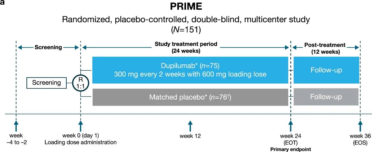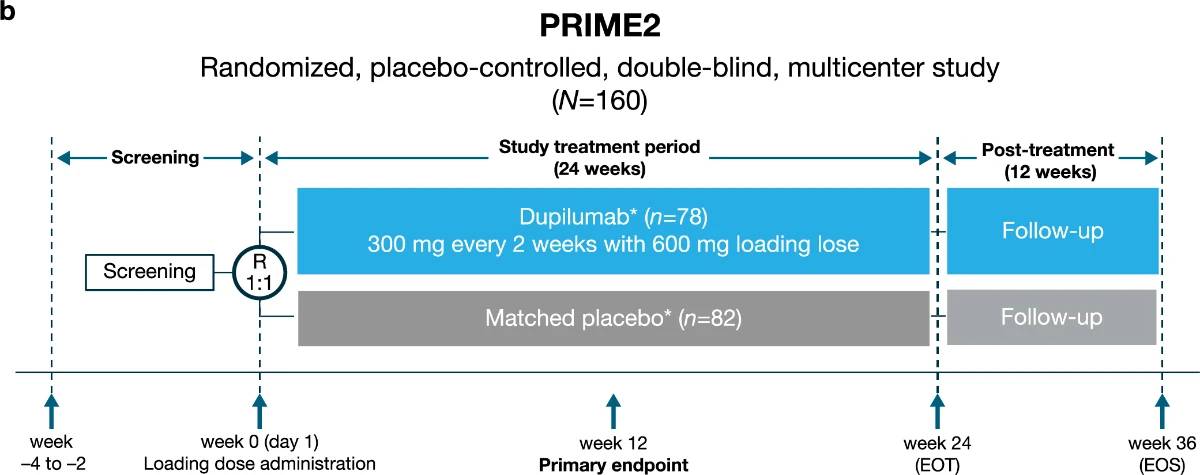 PRIME and PRIME2 were phase 3, randomized, placebo-controlled, double-blind, multicenter, parallel-group, 24-week trials designed to evaluate efficacy and safety of dupilumab in adults with PN inade-quately controlled with topical prescription therapies. Patients were enrolled in 16 countries in North and South America, Europe and Asia, from 12 December 2019 to 3 February 2022 (PRIME) and 16 January 2020 to 22 November 2021 (PRIME2). Each study had a 2–4-week screen-ing period, followed by a 24-week intervention period and a 12-week post-treatment follow-up period (Extended Data Fig. 1).The PRIME and PRIME2 protocols were developed by the spon-sors, Sanofi and Regeneron Pharmaceuticals Inc. (redacted protocols are provided in Supplementary Data 1). Data were collected by the investigators and analyzed by the sponsors. The studies were con-ducted in accordance with the Declaration of Helsinki, the International Conference on Harmonisation Good Clinical Practice guideline and applicable regulatory requirements. The local institutional review board/ethics committee at each study center oversaw trial conduct and documentation (institutional review board from 7 February 2020; Supplementary Data 2; the complete list of investigators is provided in the Supplementary Information). All patients provided written informed consent before participating in the trial.