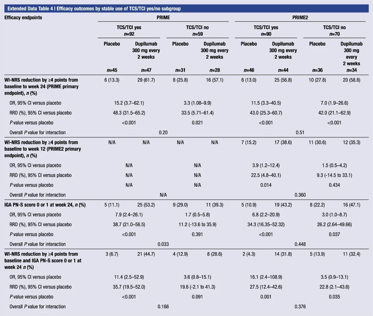 • Proportion of patients concomitantly achieving a ≥4-point reduction in WI-NRS with an IGA PN-S of 0 or 1 at week 24 (PRIME and PRIME2, United States and United States-reference coun-tries only)