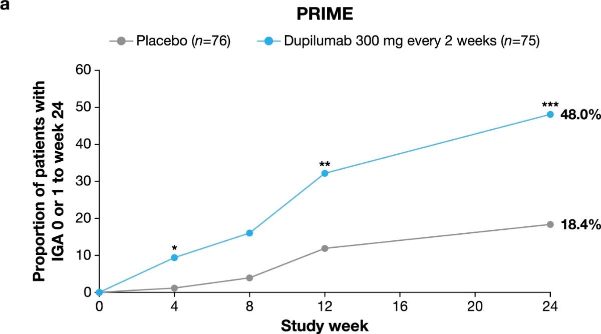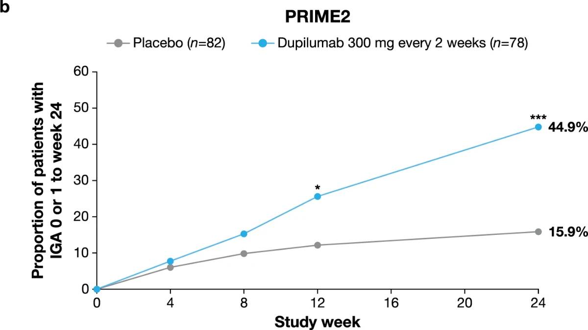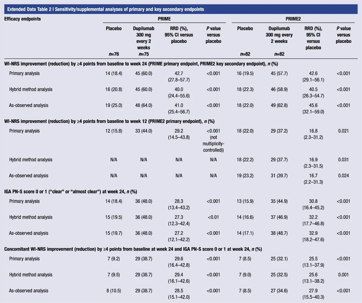 • Proportion of patients with IGA PN-S 0 or 1 at week 12 (only multiplicity-controlled in PRIME2, secondary non-multiplicity-controlled endpoint in PRIME)