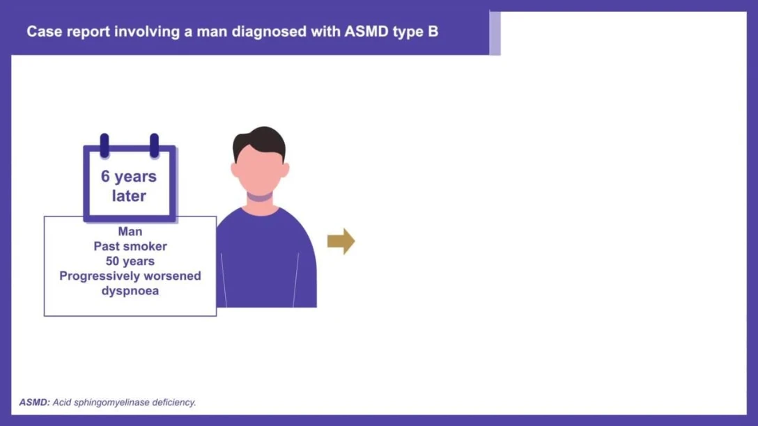 Acid sphingomyelinase deficiency (ASMD), also called Niemann-Pick disease, is a lysosomal storage disorder with some pulmonary involvement in adults. However, the disease may evolve towards clinically relevant respiratory symptoms that require referral to the pulmonologist for management. Based on two case reports illustrating respiratory impairment, the aim of this video which is based on a published case report is to review clinical features, diagnosis, respiratory prognostic and therapeutics for the pulmonologist.