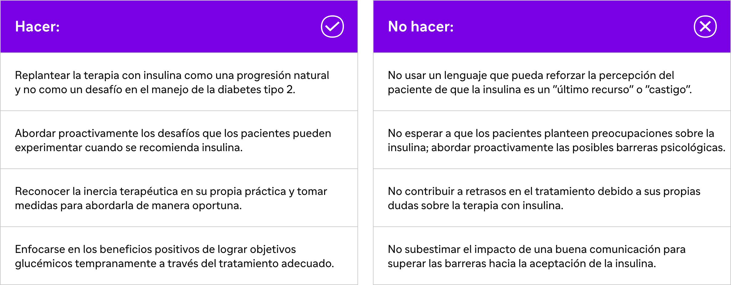 El uso de un lenguaje de apoyo, sin prejuicios, puede ayudar a que los pacientes vean de manera positiva la insulina y otras intervenciones10.