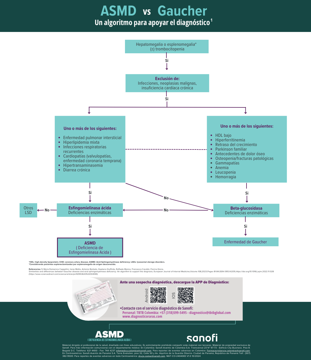 Referencias: 1. Maria Domenica Cappellini, Irene Motta, Antonio Barbato, Gaetano Giuffrida, Raffaele Manna, Francesca Carubbi, Fiorina Giona,Similarities and differences between Gaucher disease and acid sphingomyelinase deficiency: An algorithm to support the diagnosis, European Journal of Internal Medicine,Volume 108,2023,Pages 81-84,ISSN 0953-6205,https://doi.org/10.1016/j.ejim.2022.11.028 (https://www.sciencedirect.com/science/article/pii/S0953620522004149)