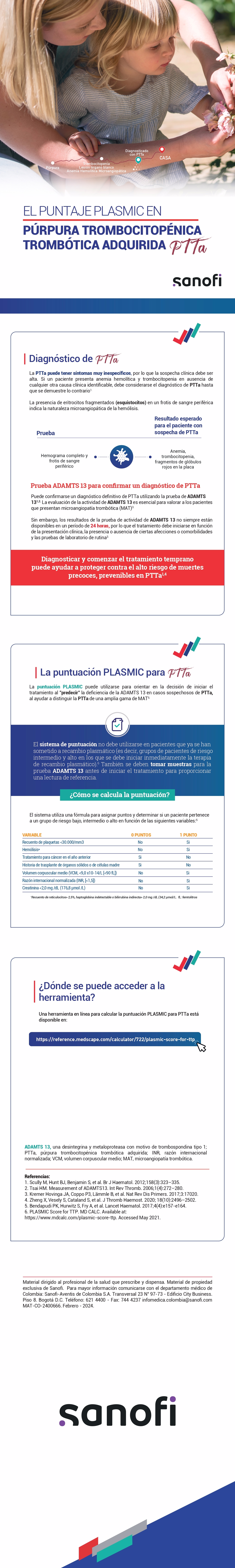 Conozca la clave para detectar la PTTa. Síntomas como anemia y trombocitopenia podrían ser señales. La prueba de ADAMTS 13 confirma, pero ¿qué hacer mientras tanto? La puntuación PLASMIC le guía