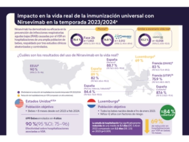 Se presentan los resultados de un metaanálisis de 32 estudios del mundo real que evalúan la efectividad e impacto de nirsevimab (Beyfortus) durante la temporada 2023-2024 del virus respiratorio sincicial (VRS). Los estudios fueron realizados en 5 países: España (18 estudios), Francia (8 estudios), Estados Unidos (4 estudios), Italia (1 estudio) y Luxemburgo (1 estudio).​