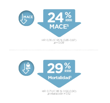 *En el subgrupo de pacientes con c-LDL basal ≥100 mg/dL: mayor incidencia de MACE en el grupo de placebo y mayor RRA (valor significativo de p interacción). Población incluida en el IPT4. c-LDL: colesterol LDL; HR: hazard ratio; IC: intervalo de confianza; IPT: Informe de Posicionamiento Terapéutico; MACE: eventos CV adversos mayores; RRA: reducción del riesgo absoluto; RRR: reducción del riesgo relativo.
