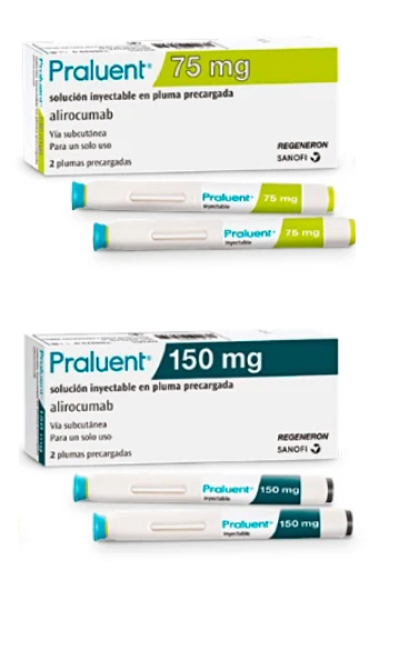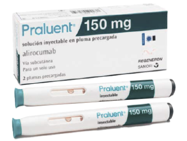 Alirocumab es un anticuerpo monoclonal humano (isotipo IgG1) inhibidor de la proproteína convertasa subtilisina/kexina tipo 9 (PCSK9). Praluent® está indicado para: Enfermedad cardiovascular aterosclerótica: Praluent® está indicado como terapia complementaria a la dieta en pacientes adultos con enfermedad cardiovascular aterosclerótica, quienes se encuentran en tratamiento con las dosis máximas toleradas de estatinas (como monoterapia o en combinación con otras terapias modificadoras de lípidos) y que no han alcanzado las metas de colesterol LDL, o son intolerantes a las estatinas o para quienes las estatinas están contraindicadas.