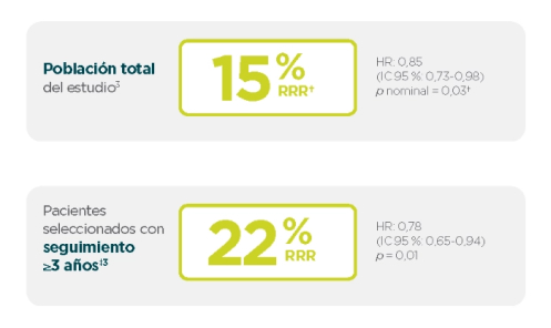 †Solo significación estadística nominal en la evaluación jerarquizada. ‡Análisis predefinido. HR: hazard ratio; IC: intervalo de confianza; iPCSK9: inhibidor de la proproteína convertasa subtilisina/kexina tipo 9; RRR: reducción del riesgo relativo.