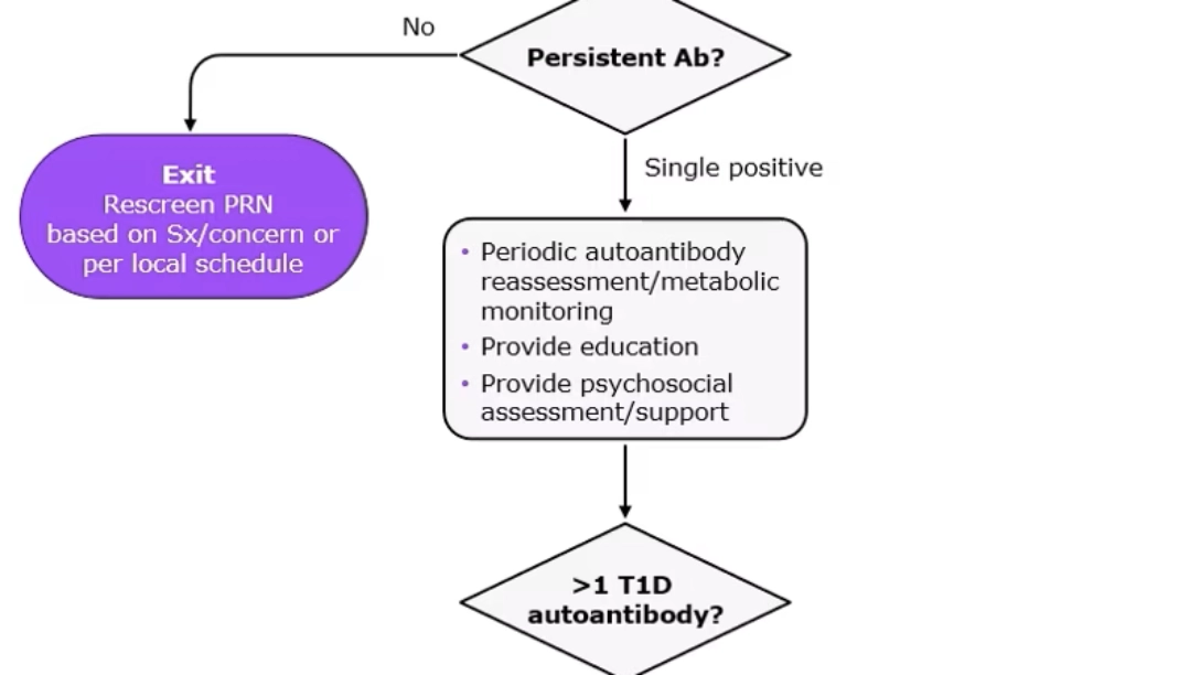 The consensus guidance published in June 2024 provides a detailed algorithm for monitoring of individuals who have been screened positive for islet autoantibodies.1 Below figure illustrates an algorithm for monitoring of people screened positive for ≥2 islet autoantibodies.1