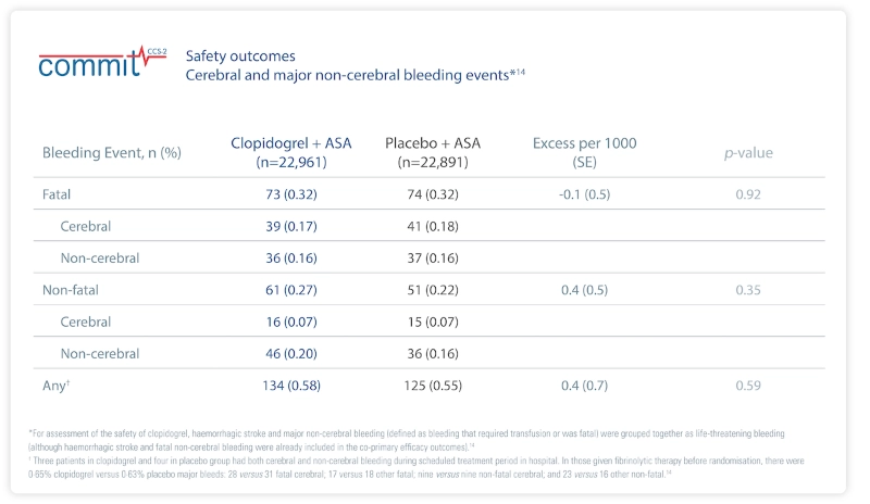 Adapted from Table 4: Effects of clopidogrel on cerebral and major non-cerebral bleeding during scheduled treatment period in hospital. The COMMIT Study. Lancet. 2005 Nov 5;366(9497):1607-21