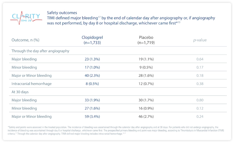Adapted from Table 3. Safety Outcomes, The CLARITY TIMI Study. N Engl J Med. 2005 Mar 24;352(12):1179-89