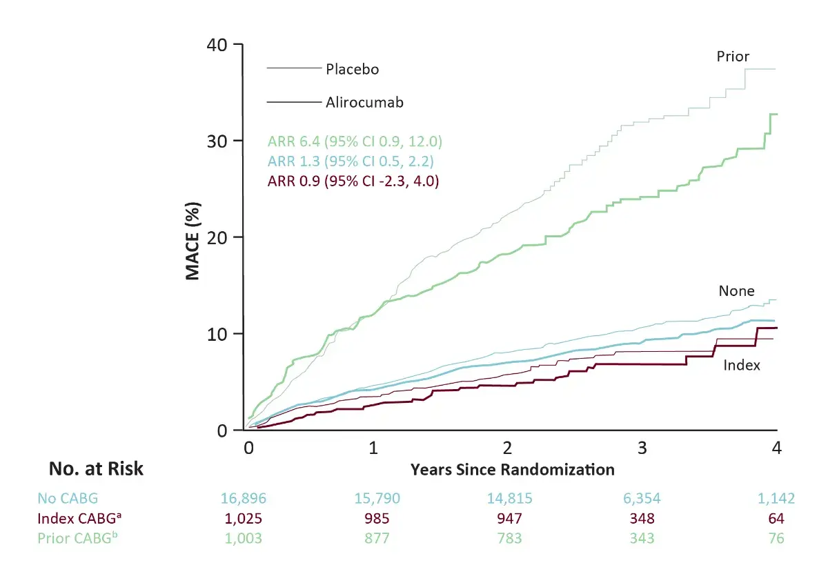 • In this sub-analysis, it was observed that, in a population that has not been fully investigated with regards to the effect of LDL-C lowering therapies, the addition of alirocumab to patients with prior CABG, recent ACS and elevated atherogenic lipoproteins despite intensive statin therapy was associated with consistent relative but greater ARR in MACE and death when compared to patients with an index or no CABG