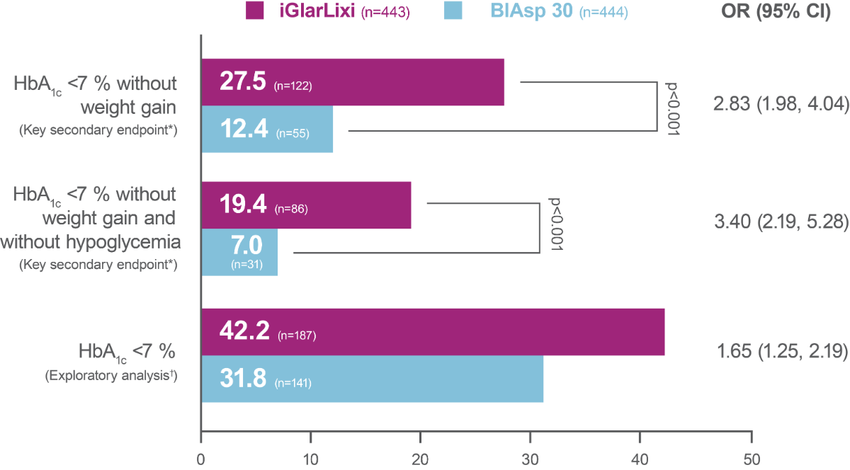 Significantly greater proportion of participants reached HbA1c <7 % (<53.0 mmol/mol) without weight gain at Week 26 or HbA1c <7 % (<53.0 mmol/mol) without weight gain at Week 26 and without hypoglycemia (<70 mg/dL [<3.9 mmol/L]) during the treatment period in the iGlarLixi versus BIAsp 30 group (key secondary endpoints*; ITT population)