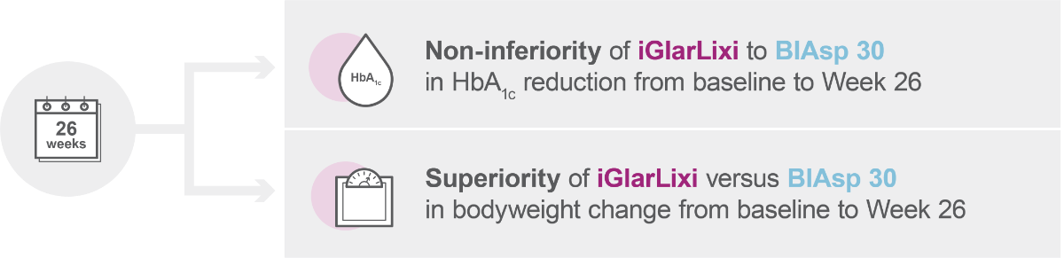 Both primary efficacy endpoints were met: iGlarLixi, demonstrated non-inferiority in HbA1c reduction and superiority in bodyweight change from baseline to Week 26 versus BIAsp 30 (ITT population). Secondary analyses showed iGlarLixi was superior to BIAsp 30 in HbA1c reduction.