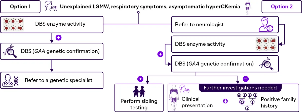 ALT: Alanine aminotransferase; AST: Aspartate aminotransferase; CK: Creatine kinase; DBS: Dried blood spot testing; DMD: Duchenne muscular dystrophy; KSA: Kingdom of Saudi Arabia; LDH: Lactate dehydrogenase; LGMW: Limb–girdle muscle weakness; LOPD: Late-onset Pompe disease; MG: Myasthenia gravis; SMA: Spinal muscular atrophy; UAE: United Arab Emirates.