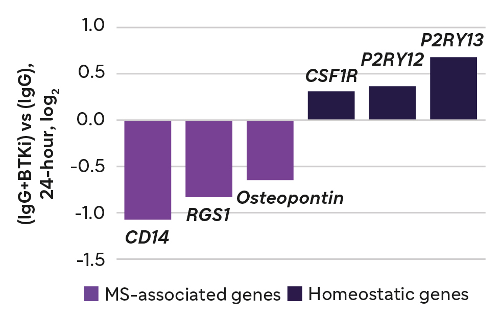 AIF1=allograft inflammatory factor 1; APOE=apolipoprotein E; BTK=Bruton’s tyrosine kinase; BTKi=BTK inhibitor; C1QC=complement C1Q C chain; CSF=cerebrospinal fluid; CSF1R=colony stimulating factor 1 receptor; HMC=human microglia clone; IC50=50% maximum drug inhibition; HLA=human leukocyte antigen; Ig=immunoglobulin; OPN=osteopontin; P2RY12=purinergic receptor P2Y12; P2RY13=purinergic receptor P2Y13; PwMS=people with MS; RGS1=regulator of G protein signalling 1; W=weeks.