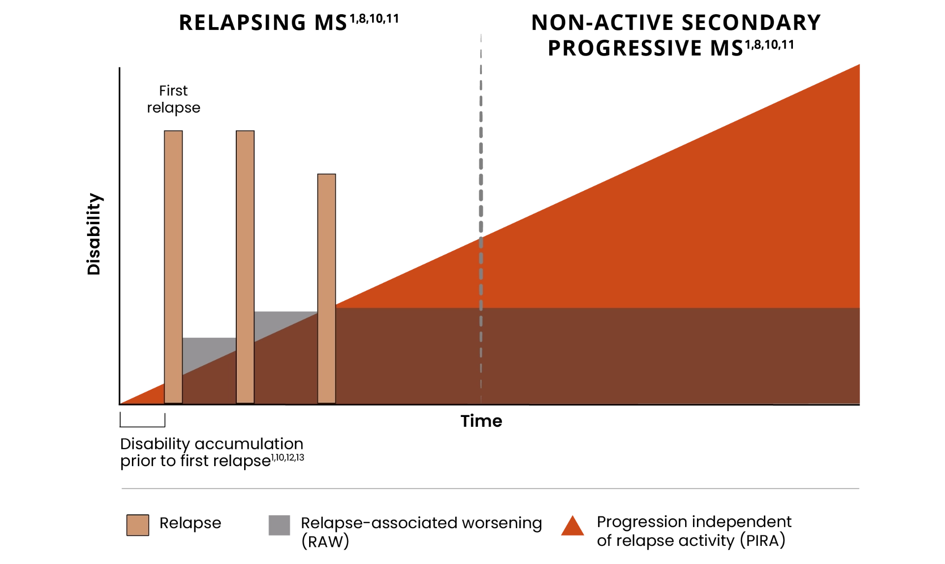 MS=multiple sclerosis; PIRA=progression independent of relapse activity; RRMS=relapsing-remitting multiple sclerosis; SPMS=secondary progressive multiple sclerosis; nSPMS=non-relapsing secondary progressive multiple sclerosis; RAW=relapse-associated worsening.