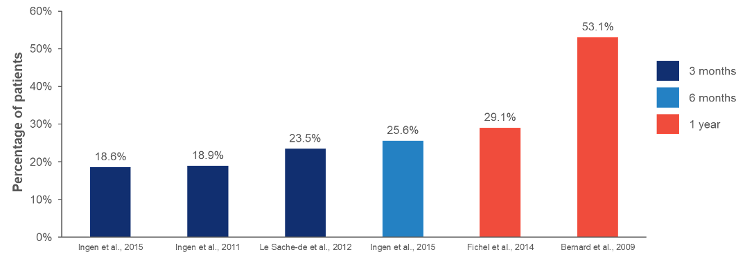Estimated relapse rates of patients with bullous pemphigoid at different timepoints after disease remission or treatment withdrawal, based on a meta-analysis study1