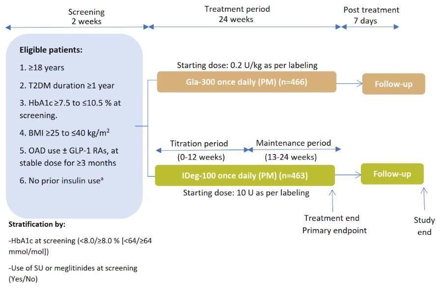 The first head-to-head RCT designed to compare the efficacy and safety of Gla-300 with IDeg-100 in participants with T2DM.