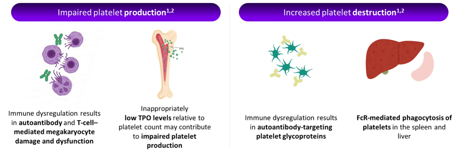 The underlying cause of ITP is complex immune dysregulation that involves multiple components of the innate and adaptive immune system driving autoimmunity and systemic inflammation1,3,4