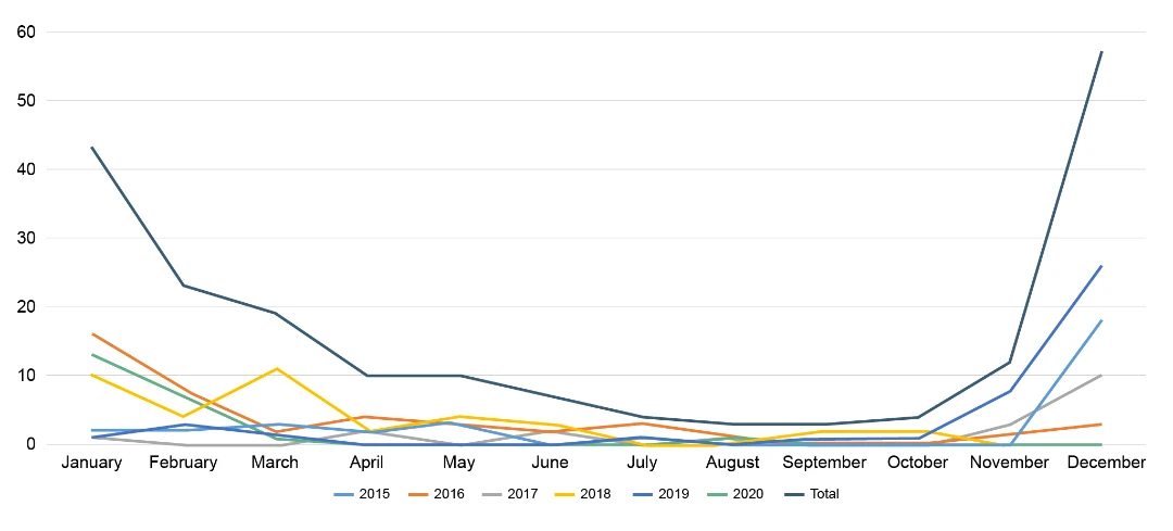 Monthly variations revealed a U-shaped pattern with most cases reported during January