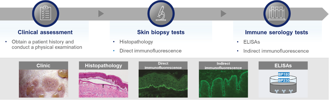 Clinical assessment and obtaining patient history, in addition to techniques such as histopathology, immunofluorescence and/or ELISA are essential for bullous pemphigoid diagnosis; however, access to these resources vary widely by country and region12–14,47