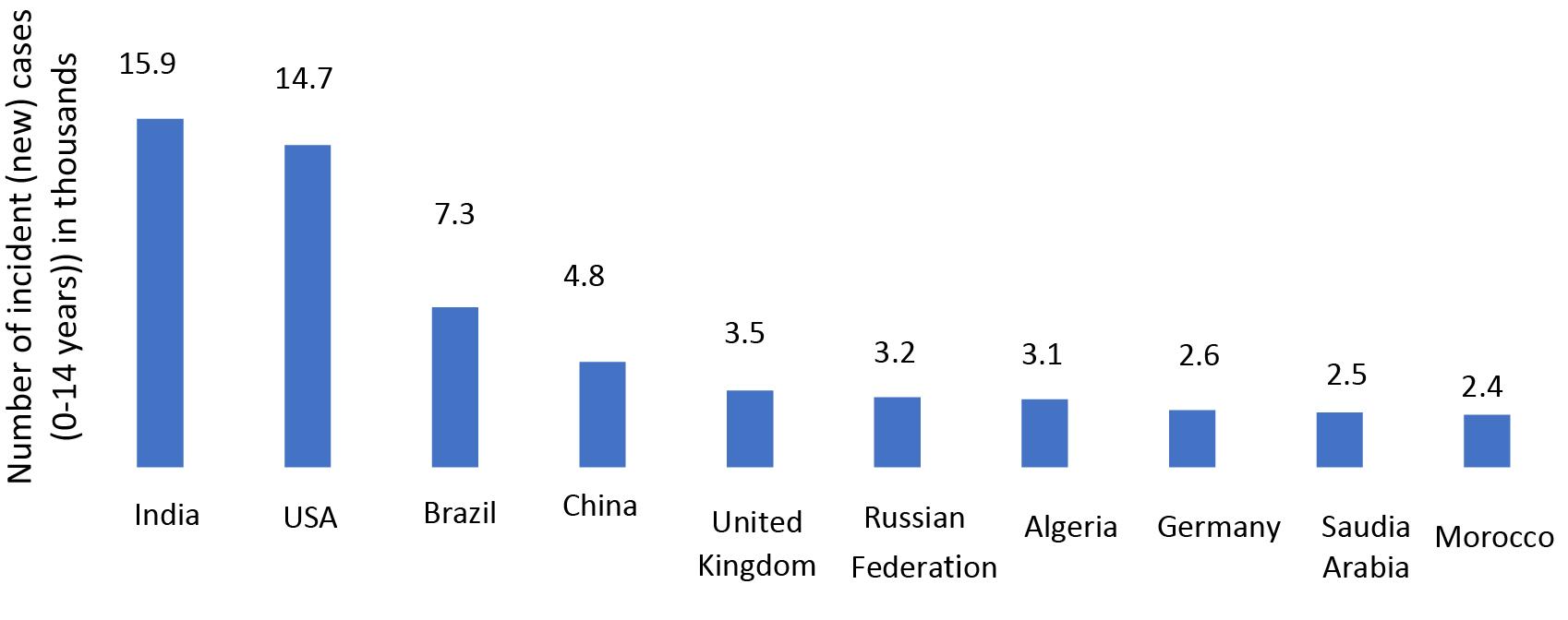 Top 10 Countries or territories for estimated number of incident (new) cases (incidence) of type 1 diabetes in children and adolescents (0-14 years), per annum