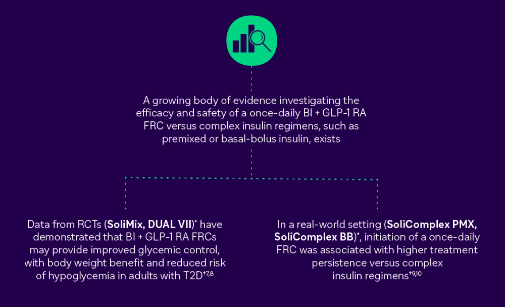 The content of this infographic summarizes key points discussed during an educational video-on-demand with Professor Rory McCrimmon and Dr Alice Cheng. Please note, two FRCs of a basal insulin and a GLP-1 RA are available: iGlarLixi (insulin glargine 100 U/mL + lixisenatide) and IDegLira (insulin degludec + liraglutide).*SoliMix was a multicenter, open-label, randomized study comparing the efficacy and safety of iGlarLixi versus BIAsp 30 in adults with T2D (n=887). DUAL VII was an open-label, two-arm parallel, randomized study comparing the efficacy and safety of IDegLira versus BB in adults with T2D (n=506). SoliComplex was a real-world, retrospective, observational study comparing iGlarLixi and premixed insulin (N=834) or iGlarLixi and BB (N=1070) in adults with T2D advancing on BI. In SoliComplex, data was collected from the US Optum Clinformatics database, therefore the US iGlarLixi pen (Soliqua® 100/33) was administered to participants. †For further details and an overview of the supporting data, please refer to the full educational video-on-demand (MAT-GLB-2204912) and the study publications.