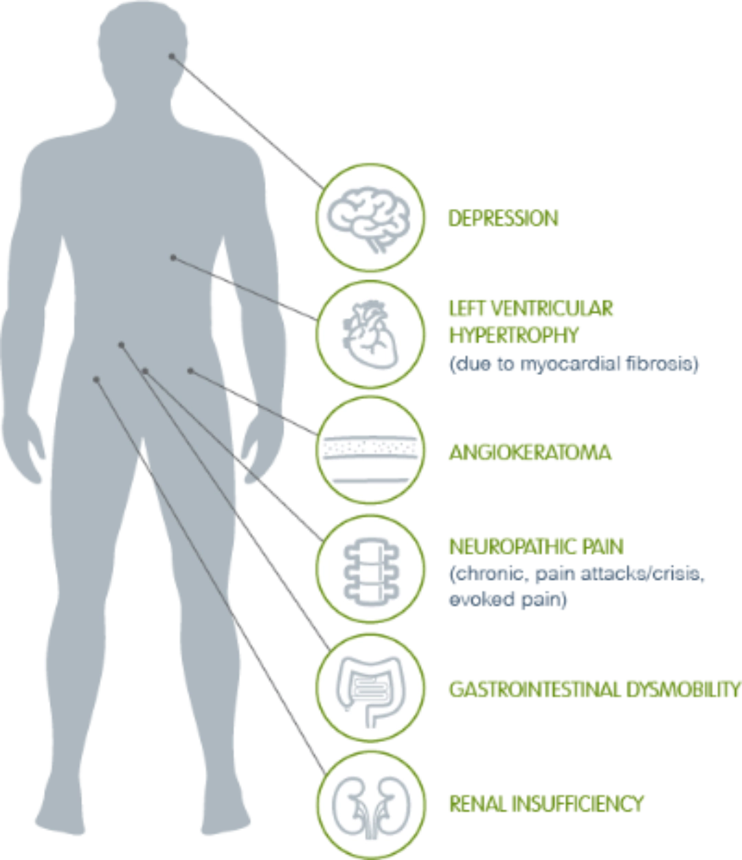 As an X-linked lysosomal storage disorder that is multisystemic, Fabry disease is caused by complete or partial deficiency of the lysosomal enzyme α-GAL A, leading to GL-3 and lyso-GL-3 accumulation that can result in damage to the heart, kidneys, and cerebrovascular system.2,3