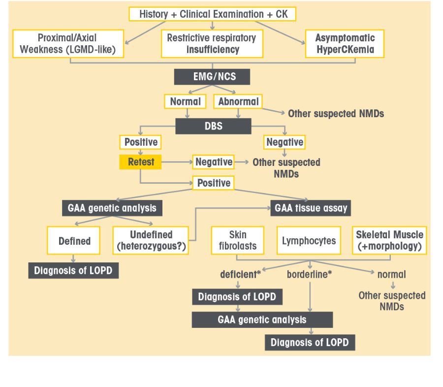 LOPD: late-onset Pompe disease; LGMD: limb-girdle muscle dystrophy; EMG/NCS: electromyography and nerve cell conduction studies; NMDs: neuromuscular disorders; DBS: dried blood spot; GAA: alpha-glucosidase A; *GAA activity: deficient <30%, borderline 30–40%