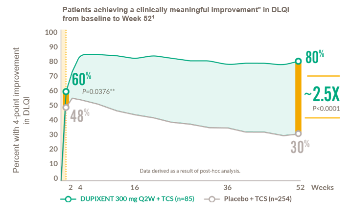 *Defined as a ≥4-point improvement in DLQI on a 0-30–point scale. **Nominal P-value. DLQI, Dermatology Life Quality Index; Q2W, every two weeks; TCS, topical corticosteroids.