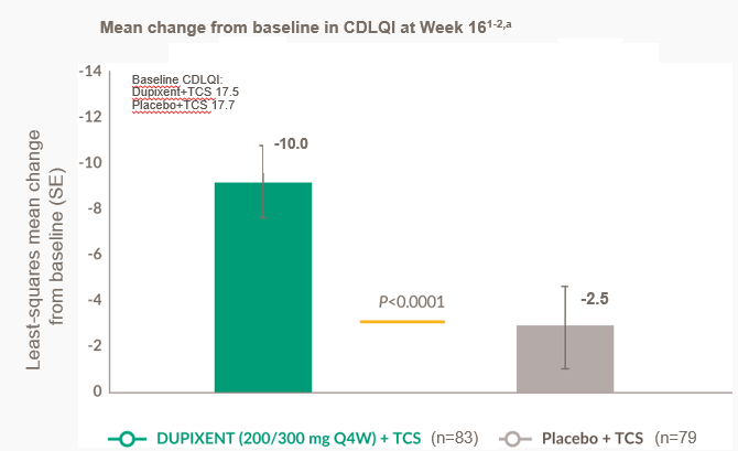 Dupixent efficacy in infant patients from 6 months to 5 years with severe atopic dermatitis over 16 weeks. Changes in CDLQI at Week 161-2