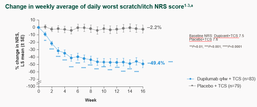 Dupixent efficacy in adult patients. Significant and sustained improvement in itch NRS seen as early as Week21,2