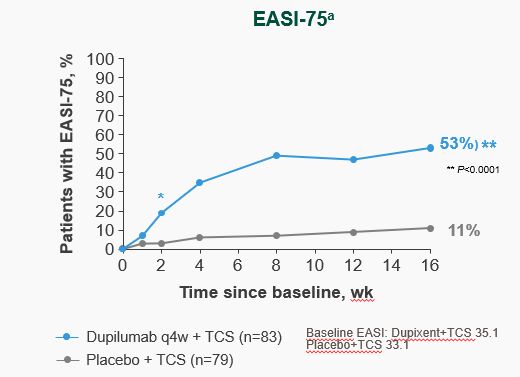 Dupixent efficacy in adult patients. Significant and sustained improvement in skin clearance EASI-75 seen as early as Week 2*1,2