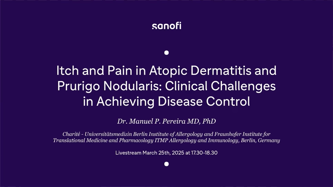 The treatment landscape in atopic dermatitis (AD) and prurigo nodularis (PN) are constantly changing for the better of patients to achieve long-term disease control. What are the challenges of today’s treatments of chronic itch and pain in AD and PN? How can we overcome them? Access our comprehensive Stockholm webinar featuring Dr. Manuel P. Pereira MD, PhD, dermatologist and researcher at Charité University Hospital Berlin, Germany.